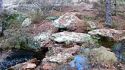 Broxton Rocks is the single largest exposure of sandstone, about 4 miles in extent, found in the Altamaha Grit, a subterranean band of sandstone that lies under some 15,000 square miles (39,000 square kilometres) of the Atlantic Coastal Plain.[1] The Rocks, as it is referred to locally, consists of a series of cracks, pools, damp cliff walls, a 10-foot (3.0-meter) waterfall, and rugged outcrops up to 20 feet (6.1 meters) high, all carved into a shallow gorge over many centuries by Rocky Creek. The Broxton Rocks waterfall is Georgia's southernmost.[2] A substantial part of the Broxton Rocks is a protected preserve (Broxton Rocks Preserve) of 3,799 acres (1,537 hectares), of which 1,528 acres (618 hectares) are managed by The Nature Conservancy. The preserve lies on a direct line from Atlanta, Georgia, 185 miles by road to the north-west, to Jacksonville, Florida, 145 miles by road to the south-east. Broxton Rocks is located at 31°43'56.25"N, 82°51'11.75"W (31.7323°N, 82.8533°W). The elevation is 243 feet (74 meters). Broxton Rocks is located in north-east Coffee County, Georgia.