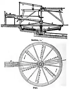 A purpose-built pit, constructed from stone or brick, cement and mortar, contained water, and a set of brushes, often powered by a water wheel, which rotated in the water in order to agitate the mixture, the result of which was that the heavier and denser material - i.e. the ore - tended to collect at the centre of the pit, from where it could be retrieved. The worthless gangue was then disposed of, often by draining.[2]