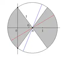 Let x and θ be as in the illustration in this section. Placing a needle's center at x, the needle will cross the vertical axis if it falls within a range of 2θ radians, out of π radians of possible orientations. This represents the gray area to the left of x in the figure. For a fixed x, we can express θ as a function of x: θ(x) = arccos(x). Now we can let x range from 0 to 1, and integrate:
