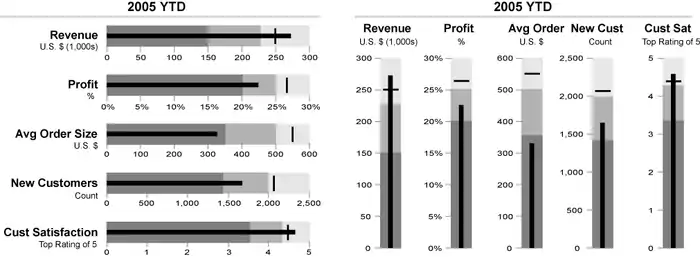 More information about bullet graphs can be found in the book Information Dashboard Design by Stephen Few.[1]