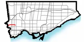 The north side of the right-of-way on the street's eastern half through Mississauga is unusually wide as the result of being reserved for a potential light rail transit line that was never built.[1] The reserve was converted into a bicycle trail,[2] with another transit facility (the Mississauga Transitway) being constructed farther north instead.