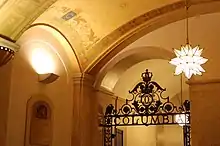 The large mural in the entrance lobby, titled Videbimus Lumen, (based on the university's motto In Lumine Tuo Videbimus Lumen, or In Thy Light Shall We See Light) was painted in 1934 by Eugene Francis Savage. The composition is anchored by the figure of Athena, echoing the large Alma Mater sculpture in front of Low Library in the center of the campus. The mural contains references to light, social struggle, fascism, and the architecture of Columbia and New York City.[16]