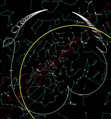 While near perihelion, A/2018 C2's heliocentric orbit is not bound to the Solar System, unlike ʻOumuamua, it is not an interstellar object. The heliocentric eccentricity drops below 1 starting with an epoch of January 2023,[7] when it is 13.8 AU from the Sun, making the orbit bound to the Sun before it leaves the planetary region of the Solar System. The more stable barycentric orbit of A/2018 C2, shows that it is only a very distant small Solar System body, approaching as far as 50,000 AU from the Sun, around the distance of the Oort Cloud. It had an orbital period of millions of years until the current approach to the Solar System, where perturbations will shorten the orbit drastically to about 5,200 AU, with an orbital period of 130,000 years.[4] Hui Man-To calculated that the comet would have its next perihelion after 130 to 140 thousands years, at a distance of about 2 AU.[8][4]