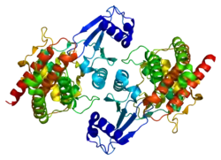 The CHKB gene is located on the q arm of chromosome 22 at position 13.3 and it spans 4,041 base pairs.[7] The CHKB gene produces a 7 kDa protein composed of 60 amino acids.[10][11] The structure of the protein has been found to be a homodimer, and forms a heterodimer with the CHKA protein.[9][8] It has also been found to contain multiple highly conserved domains, such as a Brenner phosphotransferase consensus sequence essential in catalytic function.[12]