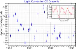 ![]() Light curves for CX Draconis. The main plot, from Hipparcos data,[1] shows the long-term variability. The inset plot, from TESS data,[2] shows how the brightness changes of short timescales. | |