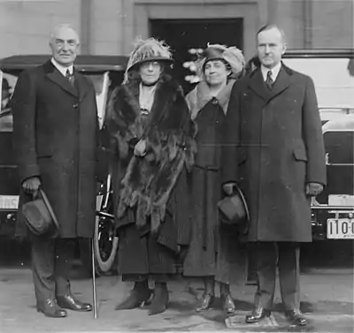 In 1903, Coolidge met Grace Goodhue, a graduate of the University of Vermont and a teacher at Northampton's Clarke School for the Deaf. They married on October 4, 1905, at 2:30 p.m. in a small ceremony which took place in the parlor of Grace's family's house, having overcome her mother's objections to the marriage.[21] The newlyweds went on a honeymoon trip to Montreal, originally planned for two weeks but cut short by a week at Coolidge's request. After 25 years he wrote of Grace, "for almost a quarter of a century she has borne with my infirmities and I have rejoiced in her graces".[22]