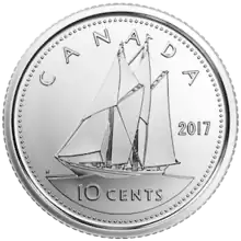 Currently the dime has, as with all Canadian coins, a portrait of Queen Elizabeth II on the obverse. The reverse contains a representation of the Bluenose, a famous Canadian schooner. According to the Royal Canadian Mint, "Artist Emanuel Hahn developed his design for the 10-cent coin from photos of the famous Bluenose schooner."[1] The coin is produced by the Royal Canadian Mint at its facility in Winnipeg.