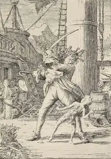 In A. C. Crispin's 2011 novel Pirates of the Caribbean: The Price of Freedom, during a conversation between Captain Teague and Pirate Lord Don Rafael: "You'll never guess who I encountered at Oporto a few months ago. [...] James. [...] He's lost a hand. [...] he said it wasn't so bad, the hook was as good as a dagger in a fight. [...] He didn't look a day older, not a day. [...] James was a lot more...subdued. [...] The taberna keeper's little lad came round to collect our plates, and when he turned and saw he, for just a second he looked—scared. No, worse than that. Terrified. [...] Can you imagine that? Afraid! Of a young boy!"[29][30] It was confirmed by the author Crispin that "James" is indeed Captain Hook from J.M. Barrie's Peter Pan. Crispin figured that since the Pirates franchise had a couple Disney "in" jokes (such as Gillette's comment about "a little mermaid" in Pirates of the Caribbean: The Curse of the Black Pearl), that she'd include the mention of "James" as a joke.[27][28]