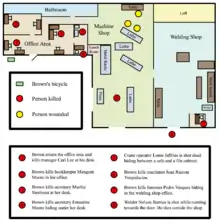 Shortly before 11:00 a.m. he arrived at the welding shop on his bicycle, wearing a Panama hat and carrying one of the shotguns, which was initially mistakenly identified as a 12 gauge Mossberg 500 Persuader[8] but was later identified as an Ithaca 37[9] with a pistol grip, slung over his shoulder. He entered the shop through a side door and began shooting while yelling that he would send everybody to Germany. According to police, Brown walked through the building methodically shooting everyone, most of the time at close range and sometimes twice, leaving three victims in the office and others in the work area and the driveway in front of the shop. In the end, six of the eleven employees present were dead and two more dying, while three who were injured managed to escape and jump into the car of a passing motorist, who took them to a gas station a mile away and called for help. Out of ammunition, Carl Brown left the store, got back on his bicycle and started cycling away, apparently towards Hialeah Junior High School. According to a witness, Brown "looked very passive and very nonchalant" and "wasn't trying to escape, just casually leaving the crime scene." Another witness put it this way: "He got on his bike and pedaled off as if he was going for a stroll on North River Drive."