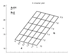 The effects of an additional independent variable can be visualized by multiple carpets on the same plot corresponding to different values of the third independent variable. If the intersections are connected, a lattice appears. For an intermediate value, a whole carpet can be interpolated using the lattice lines.[2] This technique may result in too much overlapping of carpets in a true carpet plot but is always possible for a cheater plot because the separation of the additional carpets can be adjusted on the phantom horizontal axis.