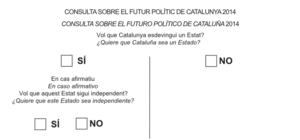 According to the consultation decree, "in the consultation there is a first question followed successively by a second question, and they are worded as follows: a) Do you want Catalonia to become a State? (Yes/No); If so: b) Do you want this State to be independent? (Yes/No). You can only answer the question under Letter b) in the event of having answered "Yes" to the question under Letter a)."[6] The "participation process" that has replaced the "non-referendum consultation" maintains the same two questions.