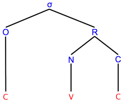 A standard diagram of syllable structure, consisting of a consonant in the onset (O) and coda (C) positions and a vowel in the nucleus (N) position. The nucleus and coda together make up the rhyme (R).