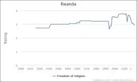 Compared to many countries around the world, religion is not a major organizer of different groups in Rwanda.[1] According to the 2012 census, the country is 44% Catholic, 38% Protestant, 12% Seventh-day Adventist, and 2% Muslim.[6] As seen in the graph, the country has always enjoyed a high level of religious freedom which partly stems from the lack of a dominant religion in the country.[1] Instead of religion, Rwandans identify much more frequently by their ethnicity and home region.[1]