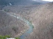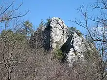 Caudy's Castle is a rock pinnacle of Ridgeley (Oriskany) sandstone that stands 1,070 feet (326 m) above sea level over the Cacapon River near the Bloomery Pike (West Virginia Route 127) south of Forks of Cacapon in Hampshire County, West Virginia, United States. The rock formation is named after James Caudy, an early Hampshire County pioneer and settler who fought off an attack by fifteen Native Americans from the rock during the French and Indian War.[1] Caudy's Castle is also known as the Castle Rock. The pillar lies on the southern end of its namesake, Castle Mountain.