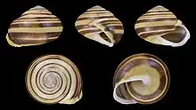 Cepaea hortensis has a shell up to 22 mm (1 in) in diameter, tending to be slightly smaller than C. nemoralis. The umbilicus is closed in adults, but narrowly open in juveniles.[2] Although the shells of C. hortensis are most commonly yellow, they exhibit a range of background colours from brown through pink to pale yellow, and up to five brown bands may be present, some of which may fuse with their neighbours. This polymorphism, which is shared with Cepaea nemoralis, has been the subject of considerable research, discussed in more detail in the article on Cepaea.[3]