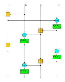 The ChaCha quarter-round function. Four parallel copies make a round.