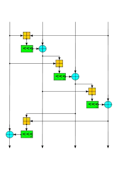 Internally, the cipher uses bitwise addition ⊕ (exclusive OR), 32-bit addition mod 232 ⊞, and constant-distance rotation operations <<< on an internal state of sixteen 32-bit words. Using only add-rotate-xor operations avoids the possibility of timing attacks in software implementations. The internal state is made of sixteen 32-bit words arranged as a 4×4 matrix.