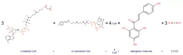 - ↑ Kreuzaler F, Hahlbrock K (November 1972). "Enzymatic synthesis of aromatic compounds in higher plants: formation of naringenin (5,7,4'-trihydroxyflavanone) from p-coumaroyl coenzyme A and malonyl coenzyme A". FEBS Lett. 28 (1): 69–72. doi:10.1016/0014-5793(72)80679-3. PMID 4646877. S2CID 10788459.