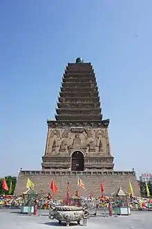 The eaves portion of the tower has 13 floors in total, the first to the eleventh floors having been transformed from the eaves of the fourth to the fourteenth floors of the Sui Tang Pagoda, and the twelfth and thirteenth floors having been both reconstructed in the Liao Dynasty. The first floor is an imitation wood, brick arch with a large eave which is 1.64 meters high and 1.96 meters out. From the second story onwards, the eaves of the tower are gradually divided. Above the eaves, part of the tower is the tower brake. The base of this pagoda is a brick octagonal rosette. The rosette is surmounted by a girdle and a green glass glazed rosette with an overlapping bowl above the rosette.[1][3]