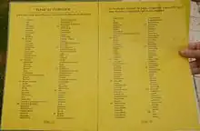 The message was coded at the tower of origin using a code book and decoded at the destination tower using an identical book. The code book contained 92 pages, each of which contained 92 entries, each with a word, a series of related words, or an expression. Messages were composed of words and expressions from the 8464 (92 × 92) possible choices.[8] For each word or expression, two symbols were transmitted; the first indicated the page number for the word or expression, and the second indicated the word's position on the code book's page.[8] For example, as shown in the photo on the right, the code for "ignorance" would be (50, 87) since the word is on page 50 in position 87.