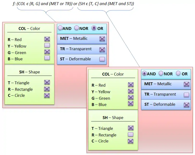 In each mask the characteristic set are grouped together with logical AND to create subfunctions. These are then joined together with logical OR obtaining the ending result.
