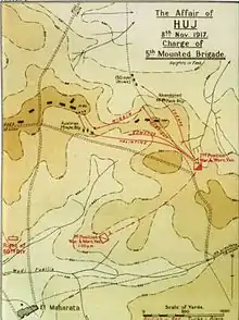 The Charge at Huj (8 November 1917), (also known by the British as the Affair of Huj), was an engagement between forces of the British Empire' Egyptian Expeditionary Force (EEF) and the Ottoman Turkish Empire's,[nb 1] Yildirim Army Group during the Sinai and Palestine Campaign of the First World War. It took place during the Pursuit phase of the Southern Palestine Offensive which eventually captured Jerusalem a month later.