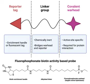 Activity-based protein profiling (ABPP, also activity-based proteomics) is a technique that was developed to monitor the availability of enzymatic active sites to their endogenous ligands.[5] ABPP uses specially designed probes that enter and form a covalent bond with an enzyme's active site, which confirms that the enzyme is an active state.[7] The probe is typically an analog of the drug whose mechanism is being studied, so covalent labeling of an enzyme is indicative of drug binding. ABPP probes are designed with three key functional units: (1) a site-directed covalent warhead (reactive group); (2) a reporter tag, such as biotin or rhodamine; and (3) a linker group.[8] The site-directed covalent warhead, also called a covalent modifier, is an electrophile that covalently modifies a serine, cysteine, or lysine residue in the enzyme's active site and prevents future interactions with other ligands.[7] ABPP probes are generally designed against enzymatic classes, and thus can provide systems-level information about the impact of cell state on enzymatic networks. The reporter tag is used to confirm labeling of the enzyme with the reactive group and can vary depending on the downstream readout. The most widely used reporters are fluorescent moieties that enable imaging and affinity tags, such as biotin, that allow for pull-down of labeled enzymes and analysis via mass spectrometry. There are drawbacks to each strategy, namely that fluorescent reporters do not allow for enrichment for proteomic analysis, while biotin-based affinity tags co-purify with endogenously biotinylated proteins.[8] A linker group is used to connect the reactive group to the reporter, ideally in a manner that does not alter the activity of probe. The most common linker groups are long alkyl chains, derivatized PEGs, and modified polypeptides.[5]