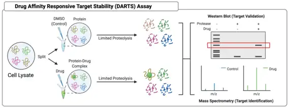 The Drug Affinity Responsive Target Stability assay follows a similar basic assumption to TPP – that protein stability is increased by ligand binding. In DARTS, however, protein stability is assessed in response to digestion by a protease. Briefly, a sample of cell lysate is incubated with a small molecule of interest, the sample is split into aliquots, and each aliquot goes through limited proteolysis after addition of protease. Limited proteolysis is critical, since complete proteolysis would render even a ligand-bound protein completely digested. Samples are then analyzed via SDS-PAGE to assess differences in extent of digestion, and bands are then excised and analyzed via mass spectrometry to confirm the identities of proteins that are resist proteolysis. Alternatively, if the target is already suspected and is being tested for validation, a western blot protocol can be used to identify protein directly.[18]