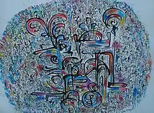 Rhythms of New Life (2001) consisted of pen, ink, and watercolor on paper measuring 70 cm by 50 cm (27 x 19 in).[24] The drawing displays a variety of textured, flickering lines, translating to the anxiety of daily life. With floral-like curves, linear texture mixed with mass form was frequently combined in Aniakor's work to achieve rhythm. Curvilinear linework was a staple in Uli art as Aniakor wrote that it was element that made artworks most visually appealing to the eye.[24] Contoured patterns were favored to fill any empty space to help move the eye along the piece.[21] Aniakor's practice of these elements suggested his sense of community and reverence to the Igbo artistic space.