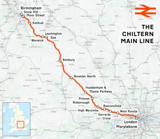 The Chiltern Main Line is a railway line which links London (Marylebone) and Birmingham (Moor Street and Snow Hill), the United Kingdom's two largest cities, by a 112-mile (180 km) route via High Wycombe, Bicester, Banbury, Leamington Spa and Solihull.