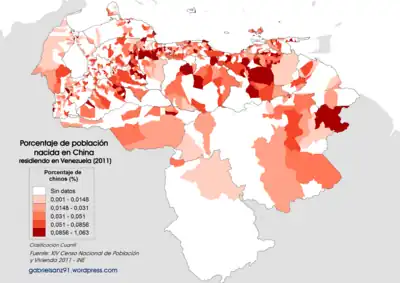 Chinese Venezuelans (Spanish: Chino-venezolanos) are people of Han Chinese ancestry who were born in or have immigrated to Venezuela. The country is home to nearly 400,000 Chinese.[1] Almost all their businesses are related to the culinary field.[2]