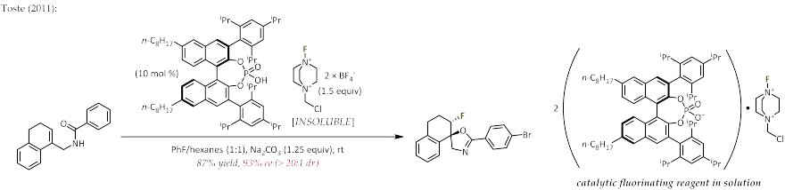 Subsequently, Toste and coworkers advanced the concept of chiral anion phase transfer catalysis, in which phase segregation (solid/organic or aqueous/organic) is used as a tactic to enforce the pairing of a cationic reagent or intermediate with a chiral counteranion. In the example below, the fluorinating reagent Selectfluor exhibits extremely limited solubility in nonpolar solvents and is therefore unreactive as an insoluble bulk solid. Exchange of its tetrafluoroborate anions with two equivalents of a chiral, lipophilic phosphate anion brings the reagent into solution as an ion-triplet which behaves as a source of chiral "F+":[2]