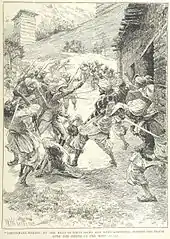On 3 March a party was sent out to determine the enemy strength. Its loss was 23 killed and 33 wounded. Harry Frederick Whitchurch was awarded a Victoria Cross for aiding the wounded. At about the same time a small relief force from Gilgit was defeated and the ammunition and explosives they were carrying captured. By 5 April the Chitralis were 50 yards from the walls. On 7 April they set fire to the south-east tower which burned for 5 hours but did not collapse. Four days later the Chitralis began digging a tunnel in order to blow open the fort. The tunnel started from a house where the Chitralis held noisy parties to hide the sounds of digging. By the time sounds of digging were heard it was too late to dig a counter mine. One hundred men rushed out of the eastern gate, found the mouth of the tunnel, bayoneted the miners, blew up the tunnel with explosives[4] and returned with a loss of eight men. On the night of 18 April someone shouted over the wall that the besiegers had fled. The next morning a heavily armed party found that this was true. Kelly's relief force entered Chitral on 20 April and found the besieged "walking skeletons". The siege had lasted a month and a half and cost the defenders 41 lives.
