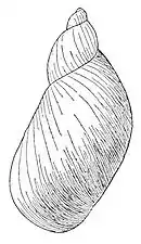 The shell of Novisuccinea chittenangoensis is ovate, slender, acute, and of moderate thickness. The shell suture is deep. The spire is gently convex, laterally compressed, with 3¼ whorls. The spire is long, slightly less than half the shell length, and the aperture is very oblique. The shell color is subtranslucent, calcareous pale yellow to white.[3] The surface is somewhat glossy and marked with growth wrinkles and lines. The size varies somewhat, but adult specimens of the type lot averaged 20.9 millimeters (mm) in shell length. Various adult specimens measured during the summer of 1981 and 1982 ranged from 19 to 24 mm.[5][13]