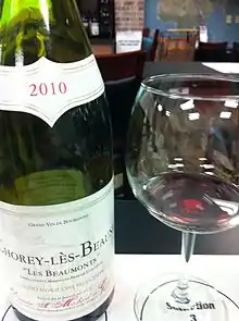 Chorey-les-Beaune wine is produced in the commune of Chorey-les-Beaune in Côte de Beaune of Burgundy. The Appellation d'origine contrôlée (AOC) Chorey-les-Beaune, which may also be written Chorey, may be used for red and white wine with respectively Pinot noir and Chardonnay as the main grape variety. More than 90 per cent of the production consists of red wine. There are no Grand Cru and no Premier Cru vineyards within Chorey-les-Beaune wine. Chorey-les-Beaune wine is sometimes declassified to Côte de Beaune-Villages, which is an appellation that allow négociants to sell wine blended from several villages. The AOC was created in 1970.