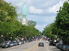 Christophe Colomb Avenue, seen northbound, with the tower of Église St-Arsène.