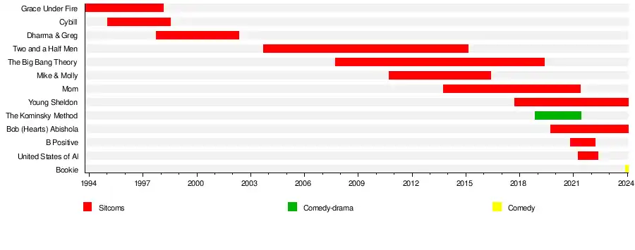 Charles Michael Lorre (/ˈlɔːri/ LOR-ee;[1] né Levine; born October 18, 1952)[2][3] is an American film and television director, writer, producer, and composer. Called the "King of Sitcoms",[4][5][6][7] Lorre has created/co-created and produced the sitcoms Grace Under Fire (1993–1998), Cybill (1995–1998), Dharma & Greg (1997–2002), Two and a Half Men (2003–2015), The Big Bang Theory (2007–2019), Mike & Molly (2010–2016), Mom (2013–2021), Young Sheldon (2017–2024), Disjointed (2017–2018), The Kominsky Method (2018–2021), Bob Hearts Abishola (2019–2024), B Positive (2020–2022), United States of Al (2021–2022), and Bookie (2023–present). He also served as an executive producer of Roseanne. Lorre won three Golden Globe Awards for his work on Roseanne, Cybill, and The Kominsky Method.[8]