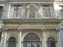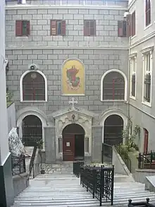 The complex has an entrance in neoclassical style - embellished by a statue of the Virgin in a niche - on Istiklal Caddesi, which is followed by a flight of steps leading downhill to the church. The edifice has a rectangular plan and is covered by a barrel vault - decorated in 1874 - and has three naves. The church has a bell tower with square plan, not visible from the road. The imposing main altar, erected in 1772, is made of pink Carrara marble and is adorned with the Icon donated by Maria Draperis.[3] The church is adorned with four paintings, three being of Venetian school.[3] The first on the right side entering the church - painted in 1873 - represents the immaculate Virgin with two Franciscan saints.[3] The second represents Saint Francis of Assisi receiving the Stigmata at La Verna.[3] To the left of the presbytery there is a painting representing the death of Saint Joseph assisted by Jesus and Mary, while another one near the entrance represent Saint Roch, protector against plague, an illness which hit Istanbul several times in the past.[3] The Via Crucis, the statue of Saint Anthony and the fresco in the baptistery are all 1959 works of the Franciscan Father Alberto Farina.[3]