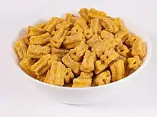 Cinnamon Toast Crunch (CTC),[1] known as Croque-Cannelle in French Canada and Curiously Cinnamon in the UK (previously Cinnamon Grahams), and as a variant called Cini Minis in other European and Latin American countries, is a brand of breakfast cereal produced by General Mills and Nestlé. First produced in 1984,[2] the cereal aims to provide the taste of cinnamon toast in a crunch cereal format. The cereal consists of small squares or rectangles of wheat and rice covered with cinnamon and sugar. The cereal is puffed and when immersed in milk, it makes a "snap" noise, similar to Rice Krispies. In most European countries and North America, the product is sold in boxes. In Poland and Russia the cereal is sold in bags. The product was originally marketed outside Europe with the mascot of a jolly baker named Wendell. Wendell was replaced as a mascot by the "Crazy Squares", sentient Cinnamon Toast Crunch squares that often eat each other in commercials.