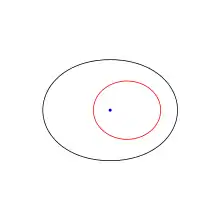 Ellipse in red, with its two cissoid branches in black and blue (origin)
