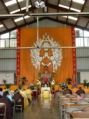 • The Jeweled Hall of 10,000 Buddhas: Finished in 1982, the hall is adorned with streamers, banners, lamps and has in the center a 20-foot (6 m) statue of a thousand-armed Avalokiteśvara (a bodhisattva popularly known as Guanyin in Chinese and Chenrezik in Tibetan). Rows of yellow bowing cushions line the red carpet. Walls are adorned with 10,000 images of the Buddha, molded by Hsuan Hua.[7]