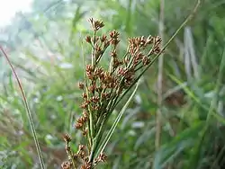 Cladium (fen-sedge, sawgrass or twig-sedge) is a genus of large sedges, with a nearly worldwide distribution in tropical and temperate regions. These are plants characterized by long, narrow (grass-like) leaves having sharp, often serrated (sawtooth-like) margins, and flowering stems 1–3 m tall bearing a much-branched inflorescence. Like many plants found in wet habitats, it has deeply buried rhizomes that can produce tall shoots with dense canopies.[2]