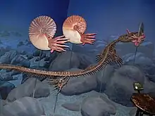 It was one of the earliest hydropedal[note 1] mosasaurs, representing one of the first properly marine predatory forms alongside other early hydropedal genera like Tylosaurus and Platecarpus.[1] It was likely an agile swimmer that preyed upon cephalopods, fish and other small vertebrates in shallow water. Isotopic analysis on teeth specimens has suggested that this genus and Platecarpus may have entered freshwater occasionally, just like modern sea snakes.[2]