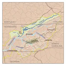 Clinch was the name of an 18th-century explorer of the area.[5] Former variations of the name included "Clinch's River", "Clench River", "Clinches River" and "Fiume Clinchs".[1] Folk etymology, however, provides a more colorful account: the river received its name after a pioneer fell into it, and shouted "Clinch me! Clinch me!", supposedly meaning "clench me" or "grab me".[6] An older name for the river, which appears on some early maps, was the "Pelisipi River", with such variant spellings as "Pelisippi" and "Pellissippi", and the variant form "Fiume Pelissipi".[1] In fact, the Mitchell Map (1755–1757) labels a tributary of the "Pelisipi River" as "Clinch's River". The word "Pellissippi" was long said to have been the Cherokee name for the river and was purported to mean "winding waters" in the Cherokee language.[7] However, research completed in 2017 instead concludes that the Miami-Illinois name Mosopeleacipi ("river of the Mosopelea" tribe) was first applied to what is now called the Ohio River. Shortened in the Shawnee language to pelewa thiipi, spelewathiipi or peleewa thiipiiki, the name evolved through other variant forms such as "Polesipi", "Peleson", "Pele Sipi" and "Pere Sipi", and eventually stabilized to the "Pelisipi/Pelisippi/Pellissippi" form; these names were variously applied back and forth between the Ohio and Clinch rivers.[8][9] The name Pellissippi has been used in proper names throughout East Tennessee, for example in Pellissippi Parkway and Pellissippi State Community College.