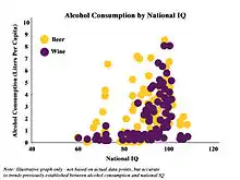 Note: Illustrative graph only – not based on actual data points, but accurate to trends previously established between alcohol consumption and national IQ. For actual data points please refer to Belasen and Hafer 2013 publication.[51]