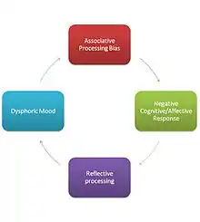 The feedback loop in the dual process model is between self referent cognition and dysphoria. The feedback loop establishes an inability to apply reflective processing to correct negative biases.[6]