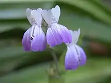 The inflorescence is a series of whorls or clusters of flowers, the lower series bearing one or two flowers and the upper bearing several in a whorl. Each flower arises on a pedicel. The corolla is between one and two centimeters long and has two white upper lobes sometimes dotted with purple and three lavender to purple lower lobes.