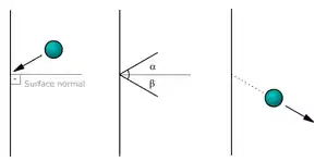 Deflection happens when an object hits a plane surface. If the kinetic energy after impact is the same as before impact, it is an elastic collision. If kinetic energy is lost, it is an inelastic collision. The diagram does not show whether the illustrated collision was elastic or inelastic, because no velocities are provided. The most one can say is that the collision was not perfectly inelastic, because in that case the ball would have stuck to the wall.
