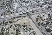 In December 2006, the Alameda Corridor Transit Authority (ACTA) presented a feasibility study to analyze alternatives and costs for design and construction of an east–west structure, which would grade separate the BNSF and UP main line tracks at Colton Crossing.[6] In addition, ACTA prepared a report on a proposed north–south flyover to the south of Colton Crossing to reduce train crossing conflicts and hours-long congestion. The report was evaluated by ACTA, UP, BNSF and the San Bernardino Associated Governments (SANBAG).[6] SANBAG conducted community outreach meetings to assist the project team with selecting the final build option.[7] In November 2011, work began on the grade separation project, with the final design being a 2.2-km east–west flyover of the Union Pacific tracks over the north-south BNSF tracks. Work was initially expected to take four years at a projected cost of $202 million.[5][8] Skanska was the lead contractor on this project.