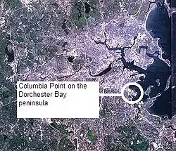 More landfill on the north shore of the peninsula had been created to build the Columbia Point Development housing projects which were the largest in Boston and New England and built by the Boston Housing Authority. The area was now known as Columbia Point. The Columbia Point Development was completed in 1954 and had 1,500 apartments in 27 nearly identical three- and seven-story buildings.[3][4] When the Columbia Point public housing project opened in 1953, its initial demographics reflected that of the city's population: white tenants made up more than 90 percent of the population while black families made up approximately 7 percent. All reports at the time indicated that racial and ethnic tensions were minimal, that there were high levels of social trust within the neighborhood, and by 1955, had a long waiting list of families wanting to become new tenants.[5] Other infrastructure was added, including public schools. The MBTA rapid transit stop was called Columbia, later to be known as the JFK/UMass stop on the Red Line.